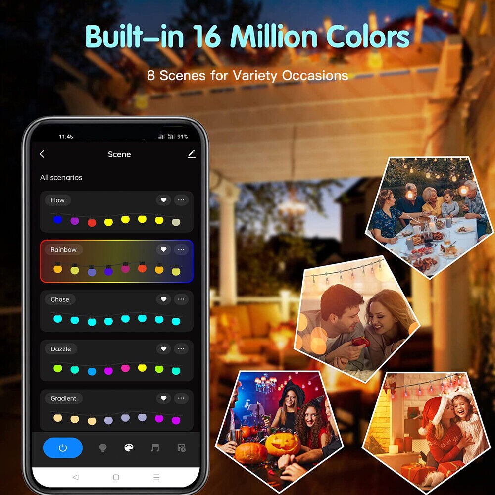 ? Custom DIY Setting--- Dimmable & Scene & Music Sync & Schedule,via WiFi App,You could adjust the brightness,also modify or pick a specific color or speed from multi modes/themes,Lots of color scheme to choose from; and the app has several preset light modes,Like: Flow/Rainbow/Chase/Dazzle/Gradient/Jump/Breathing/Blink;and also add a timer schedule ; Choose “Music” mode(Rhythm/Game/Romantic) in the App,the colorful patio string lights will spectrum with light and color changing automatically base on the ambient sound;