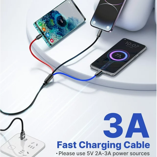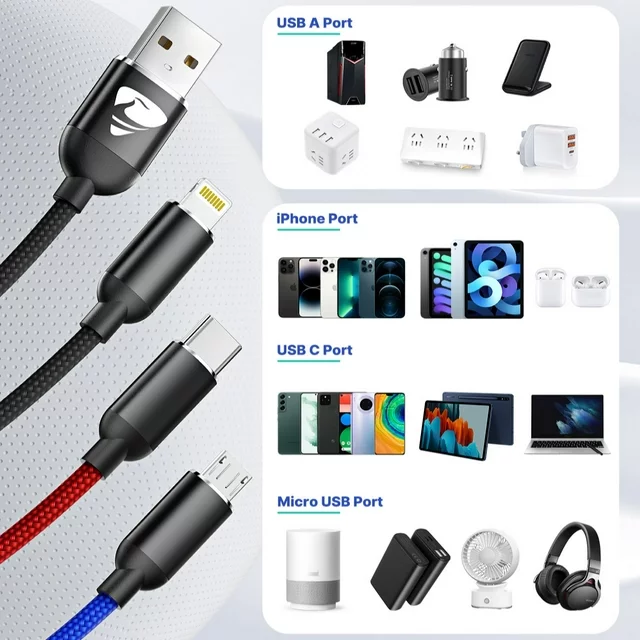 USB 2.0: Universally compatible for Phone, Type-C & Micro devices, it has 3 different ports to USB cable for your most needs, it can charge 3 devices at the same time.
