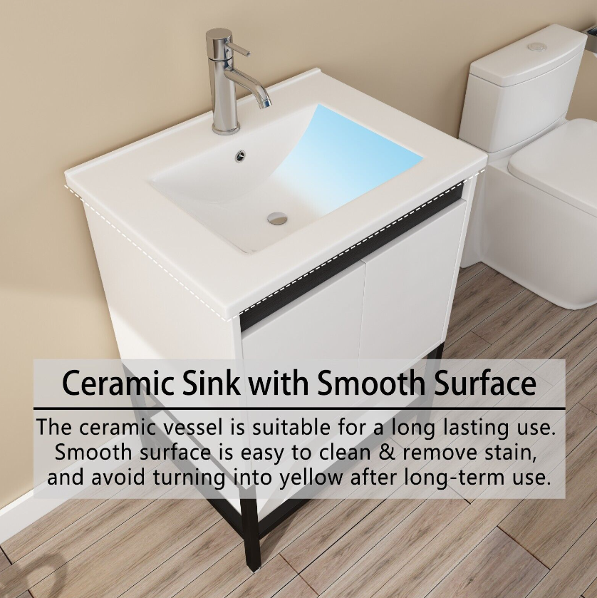 【Bathroom Vanity With Sink】: Easy clean and grand with the integrated sink made of premium ceramic, solid and durable. Features an overflow hole that prevents water leaks and spills. For your convenience, we have predrilled a single faucet hole. The faucet and drain are also included.