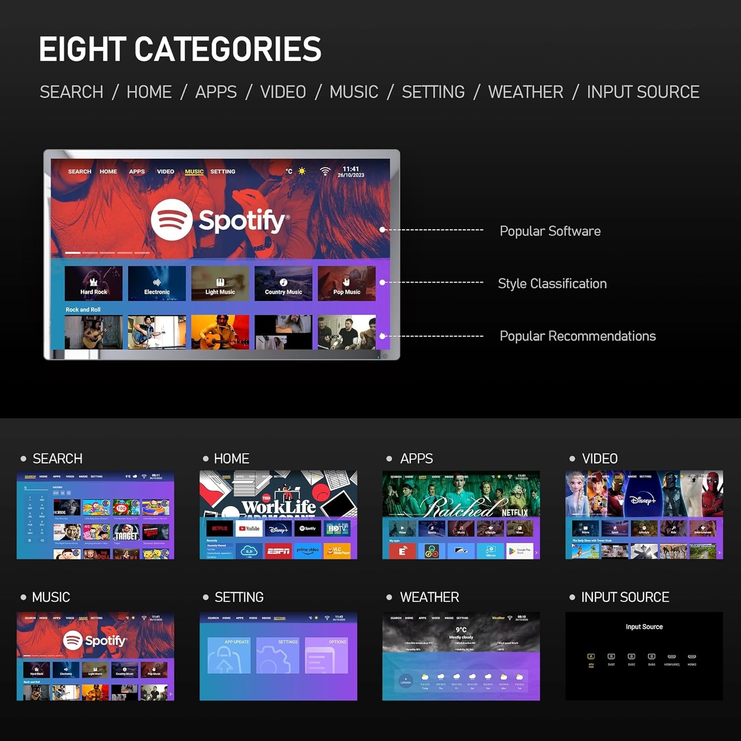 InterfaceHDMI ARC, HDMI, SPDIF, TV Input, USB, RJ45, DV 12V Input.