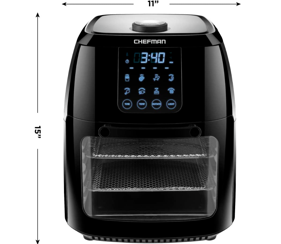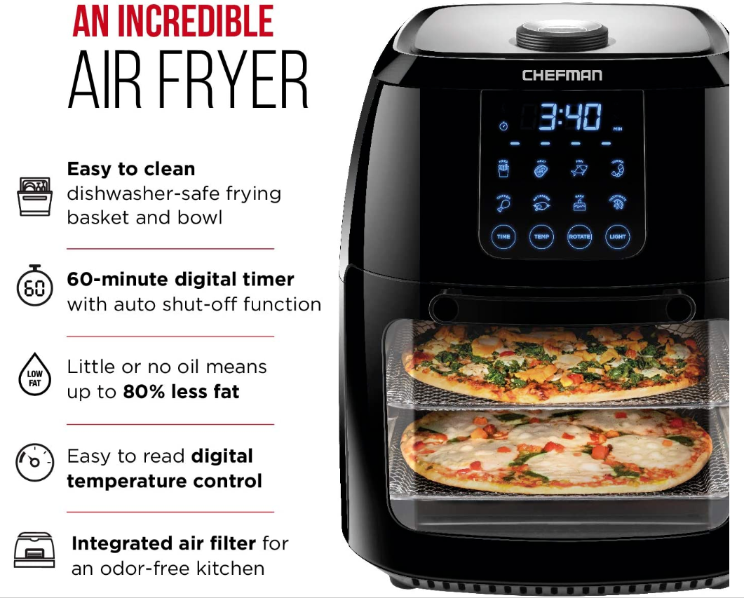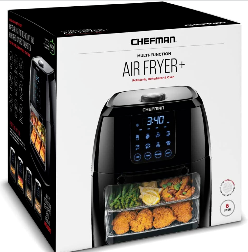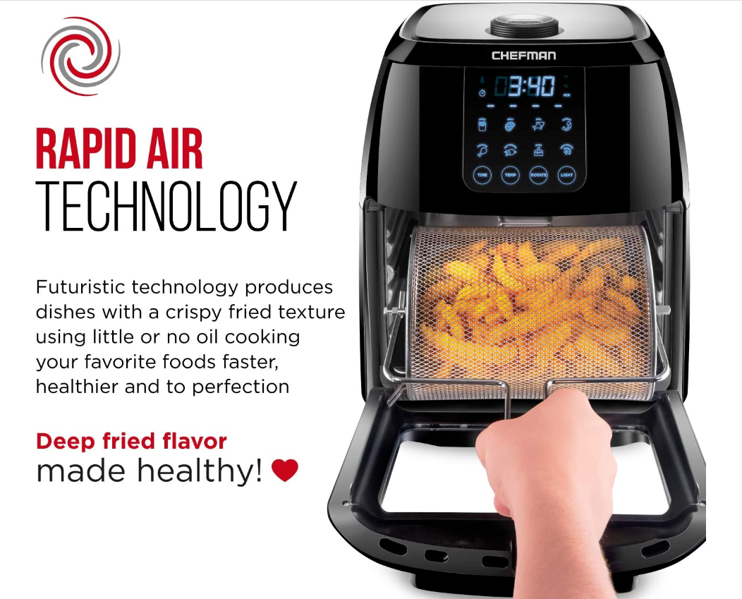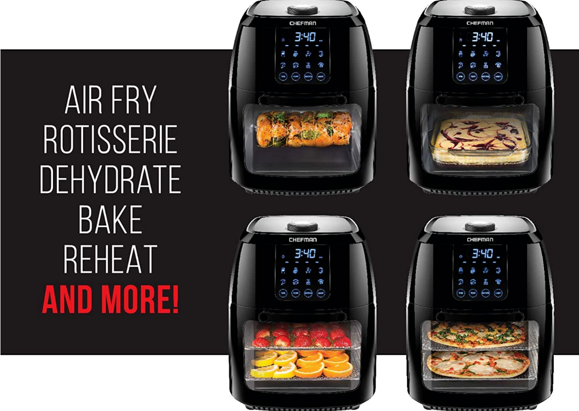 Say goodbye to clutter and hello to this multi-functional air fryer! The Chefman Multi-Functional Air Fryer with Rotisserie and Dehydrator Function handles any cooking, baking, or air frying task, creating the crispy fried texture you love with little to no oil. With the highly efficient rapid air technology and high-speed convection system, you can get even, crispy fried texture using little to no oil. Perfect for feeding a crowd, this Multi-Function AirFryer features a 6.3-quart capacity and 8 preset options - you can use it to air fry, roast, dehydrate, bake, reheat, and more! Interior lighting allows you to easily watch your food as it cooks. For best results while air frying, racks should be switched in middle of cooking. Accessories include 2 air flow racks, rotisserie spit and forks, rotating basket, rotisserie retrieval tool and drip tray. With this unit's 3 in 1 functionality, you'll save valuable cabinet space all the while reaping the benefits of its versatility. Removable drip tray and dishwasher safe parts make cleaning a breeze. With the dehydrating preset, you can make your own dried fruit slices, long-lasting dried herbs, delicious beef jerky and more!