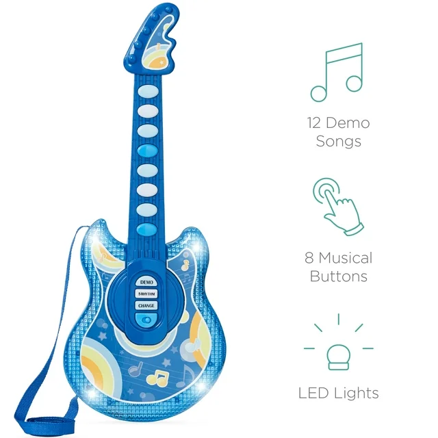 Let your child rock out to the strum of their own guitar! Complete with an easy-to-use mini electric guitar, working microphone, and adjustable mic stand, this fun set gives little ones the confidence to be the star of the show. Kids can jam to 12 preset tunes or plug in an iPod, smartphone, MP3 player or other media to pretend they're the mastermind behind their favorite music. With bright-shining lights built into the body, this guitar will keep any toddler at the center of attention! Requires 3 AA batteries, sold separately.
