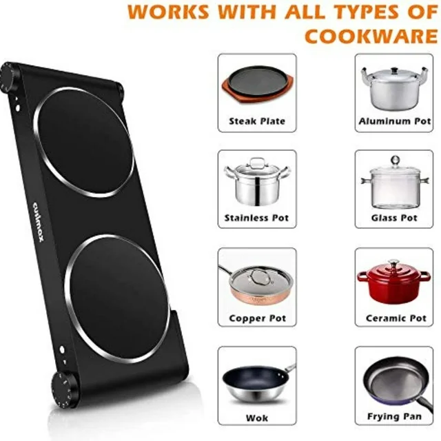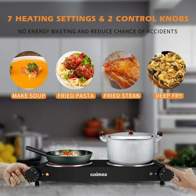 CUSIMAX 1800W Electric Double Hop Plate, Portable Burner for cooking, Electric Infrared Stove, Dual Countertop Electric Cooktop. With a mini size, Cusimax double burner is great for everyday use such as frying steak, grilling cheese, boiling water, making soup, cooking pasta, hot sauce, etc., or as an extra cooking appliance in a busy kitchen. Whether it's your home kitchen, apartment, RV, office, or back garden, it can meet your different needs.