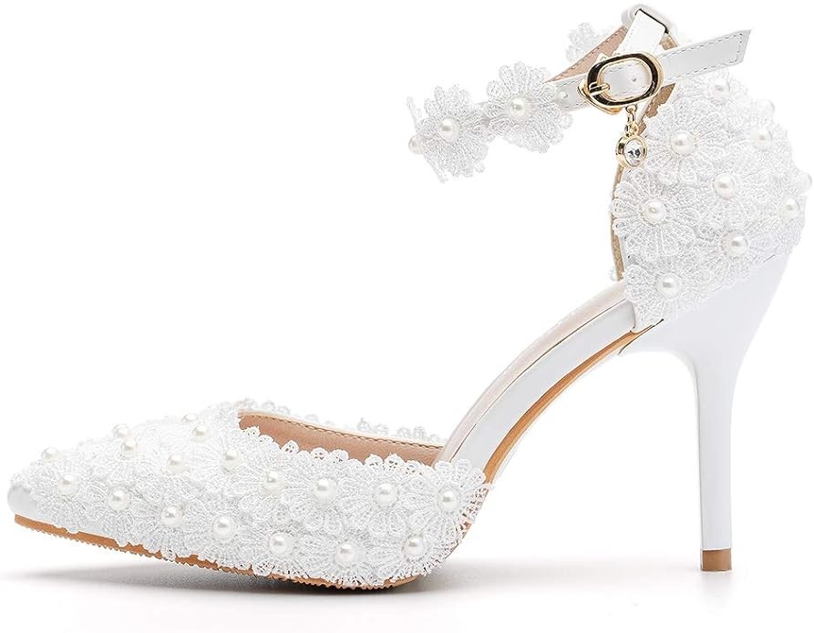 Dress First Women's High Heel Pumps Closed Toe Sandals with Floral Lace Pearls Strap Stiletto Bridal Wedding Party Shoes,3.74"