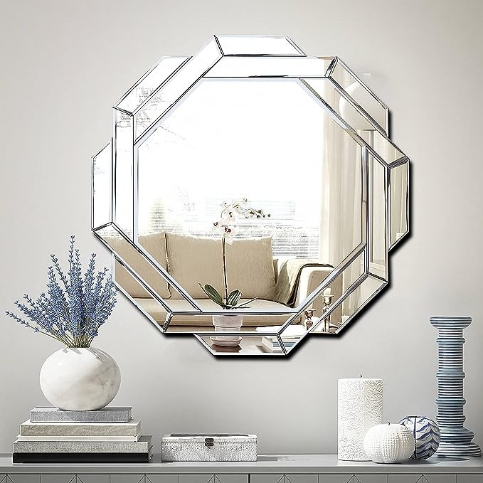 PRODUCT SIZE:23.6X23.6X0.79 inches hexagonal silver helicoid wall decor mirror. A floating,frameless wall mirror with small specular slices around.HFY home decoration mirror.