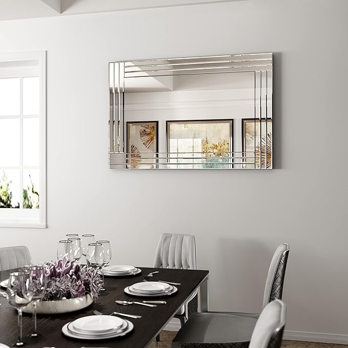 • Modern and unique mirror wall decor with glass frame creates gorgeous and classic look. Well made design surface increases stereoscopic and sense of reality. Our solid wood backing design reinforce the product, which is more safety and stable than others.