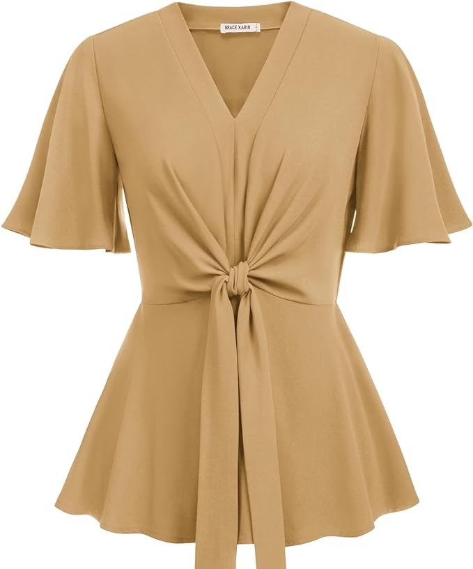【ELEGANT STYLE】Elegant women tops, peplum Tops, business casual outfits, short sleeve shirts, fashionable ruffle blouse tops, slim fit blouse, classic v-neck and elastic waist a line swing design can show your superb necklace, accentuate your curvy and improve the feminine charms.