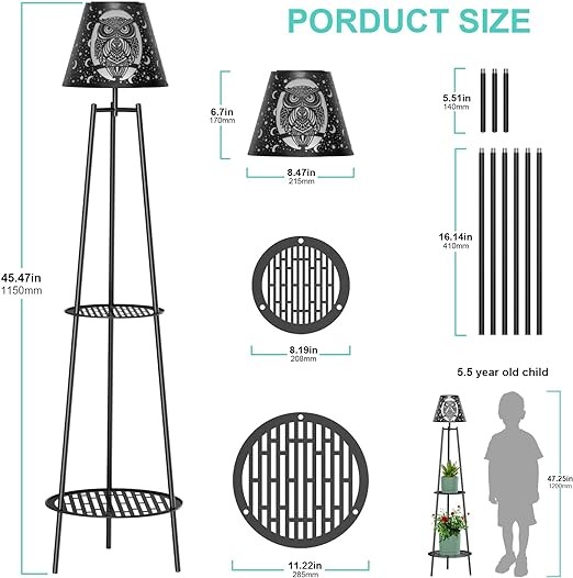 INNOVATIVE SOLAR STREET LIGHT: This solar street light gets rid of the monotony of the traditional street light, the lampshade part of the lampshade is so cute with the owl carved by the hollowing out technique. The structure of the lamp body adopts a triangular structure, and there are two plant shelves underneath. You can put flower pots or some other garden statues on the shelves to enrich the decoration of the terrace garden patio.