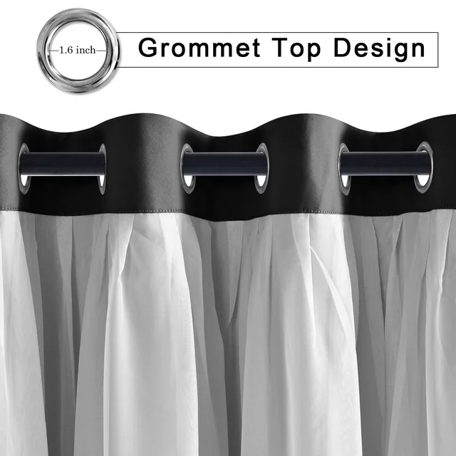 PREMIUM MATERIAL: Hiasan mix & match blackout curtains with white sheer overlay are crafted with high quality fabric. Great soft and durable curtains are idea for home decor. Each package includes 2 double-layered panels measuring 38"W by 84"L inch.Each panel has 8 silver Grommets (1.6" inner diameter). These light blocking curtains are in combined design, so it is easy to hang and slide on one curtain rod