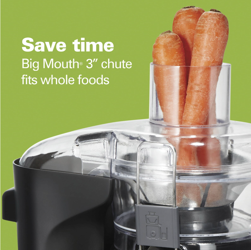 • SAVE TIME — 3" BIG MOUTH® CHUTE FITS WHOLE FOODS. Since the 3" chute fits a whole apple, peeled orange or handful of kale, you can minimize prep time and skip the time-consuming step of pre-cutting with the juice extractor.