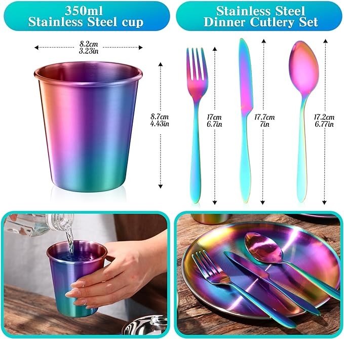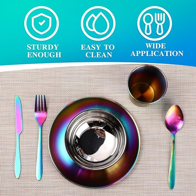 • Exquisite Craftsmanship: this rainbow tableware set with colorful shinning look, quality titanium rainbow coating, it enhances surface hardness to reveal both artistic and safety, mirror polished finishing, smooth surface and edges, extremely serviceable and easy to maintain, don't worry the color fading or peel off