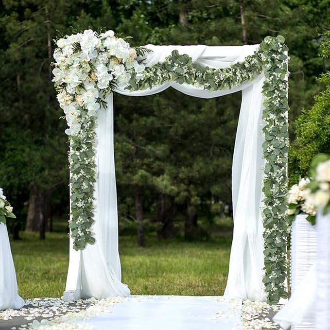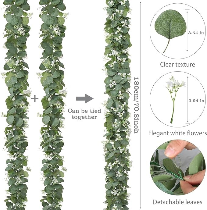 • ?【Quantity and Size】Package includes 4 pack faux eucalyptus garlands. Each greenery garland is about 5.9 FT Long, with lush silver dollar eucalyptus leaves and many beautiful white flowers. Our artificial garlands look very full, three-dimensional and layered, and more dense than other hanging vines.