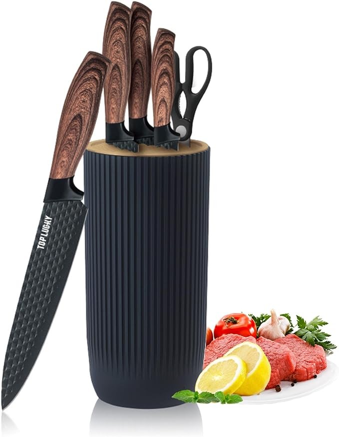 【Practical and Beautiful 6-Piece Set】This 6-piece knife set with knife block includes: 12" Kitchen Knife, 12.6" Chef's Knife, 12.8" Japanese Knife, 9.3" Utility Knife, 7.9" Kitchen Scissors, 9.3" Universal Knife Block. It can help you easily cut meat, fish, vegetables, fruits, etc. The practical and beautiful kitchen essential knives give you a good cooking experience.