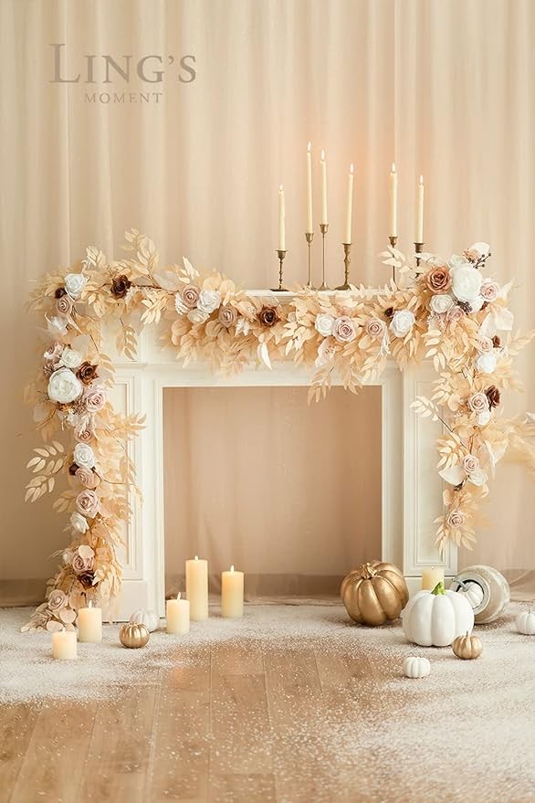 Material: On silk eucalyptus and willow leaf garlands base, natural touch peony as the main flower dotted with avalanche rose, rose, vendela rose, escimo rose, citrus leaf, reed, pampas grass, berry, golden branch and stem, this flower garland is perfect for romantic warm winter wedding decorations.