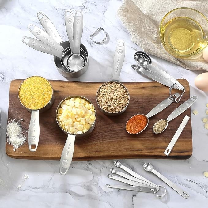 [Complete Set of 21] Includes 8 Measuring Cups (1/16 cup, 1/8 cup, 1/4 cup, 1/3 cup, 1/2 cup, 2/3 cup, 3/4 cup, 1 cup), 7 Measuring Spoons (1/8 tsp, 1/4 tsp, 1/2 tsp, 3/4 tsp, 1 tsp, 1/2 tbsp, 1 tbsp), 1 Leveler & 5 Mini Measuring Spoons (Tad, Dash, Pinch, Smidgen, Drop), totally 21 sizes to meet all your dry and liquid measuring needs.