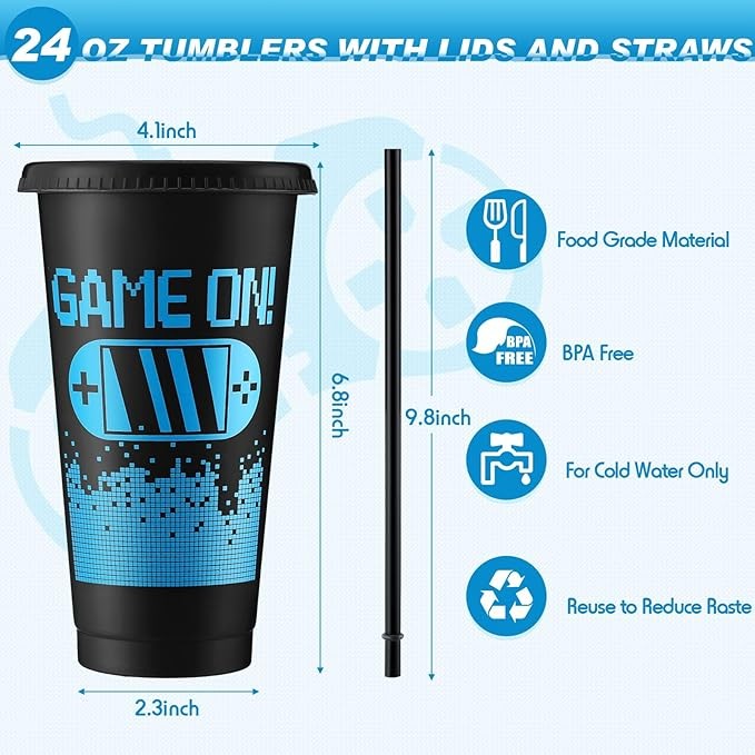 Rich in Quantity: you will receive 24 pcs video game plastic tumblers with lids and straws in 6 different patterns, main colors are blue and black, enough quantity to meet your daily use and replace requirements, very suitable for the game theme party
