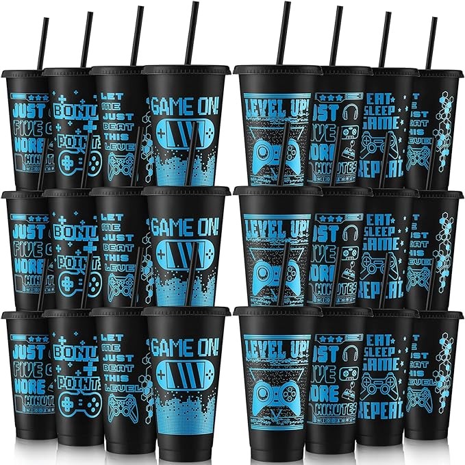 Video Game Elements: these plastic iced coffee cups are designed with various gaming elements, such as game controllers and texts, which can add focus to your gamer themed events, ideal for boys and gaming lovers birthday parties