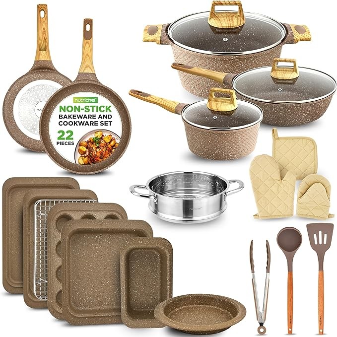 • USER-FRIENDLY DESIGN - Embrace eco-conscious cooking with our food-grade ready and user-friendly kitchenware. The pots and pans nonstick set is constructed with care, that is ready to use for gas, electric, ceramic, and induction counter cooktops.