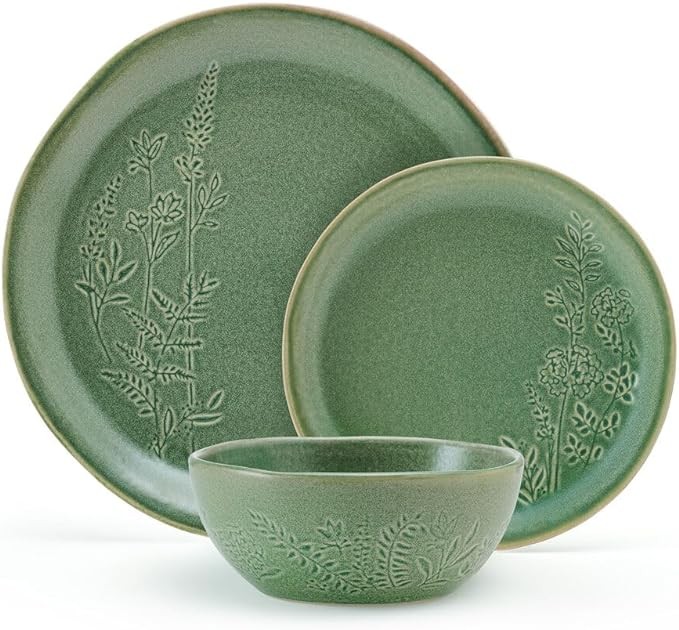 STUNNING FINISH: simple, coupe shapes are escalated to stylish elegance by green debossed, pressed wild flowers that create an eye-catching landscape across your dining table