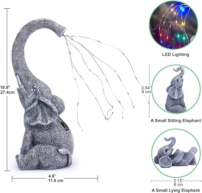 • 【Beautiful Home Garden Decor and Great Gifts】The resin elephant statues with solar lights suitable for garden decor/home decor/house decor/lawn ornaments/front porch decor/yard decorations outdoor/back decor/backyard decor. A perfect choice as birthday gifts for Mom/Women/Grandma/Wife/Daughter/Sister/Aunt White Elephant gifts Fathers Day /Mothers Day gifts Christmas gifts Diwali gifts