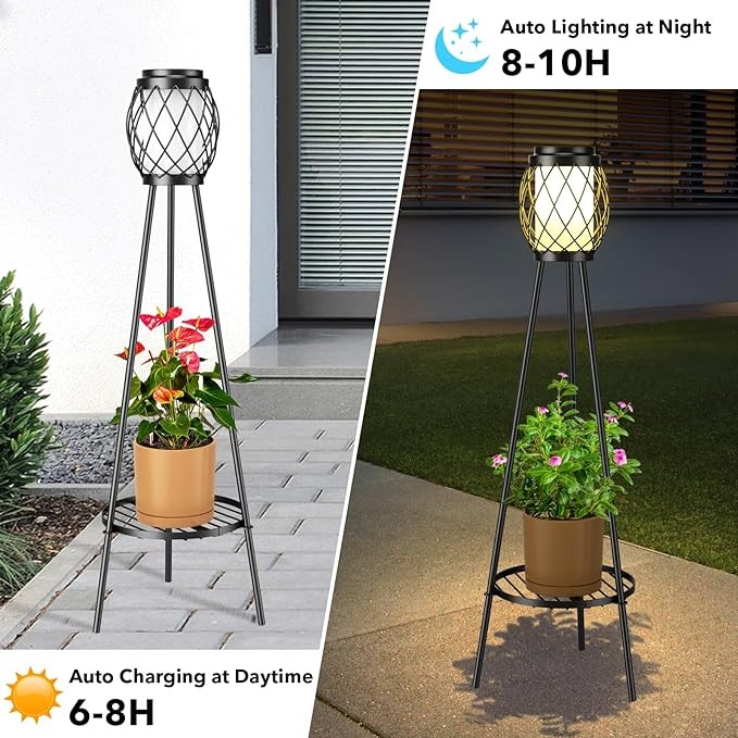 • Innovative Solar Street Light: Unlike traditional solar floor lamps, our 36-inch solar street light features a plant stand concept. This innovative design allows you to place your favorite plants or sundries, tools, etc., adding a touch of fresh nature to your outdoor garden, patio, deck.