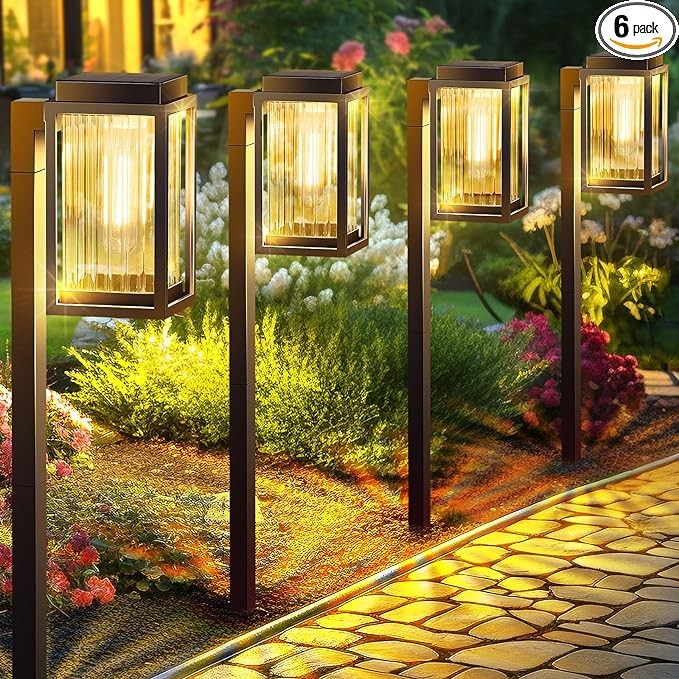 【Durable & Unique Solar Pathway Lights Outdoor】: Upgraded with a modern stripe transparent square shade, filament bulb, and strong stake, our solar landscape lights outdoor are more durable and beautiful. Perfect for pathways, lawns, walkways, and gardens, these pathway lights solar powered provide both lighting and decoration. Enhance your garden's landscape with these outdoor solar lights, lighting up your path home in a unique way.