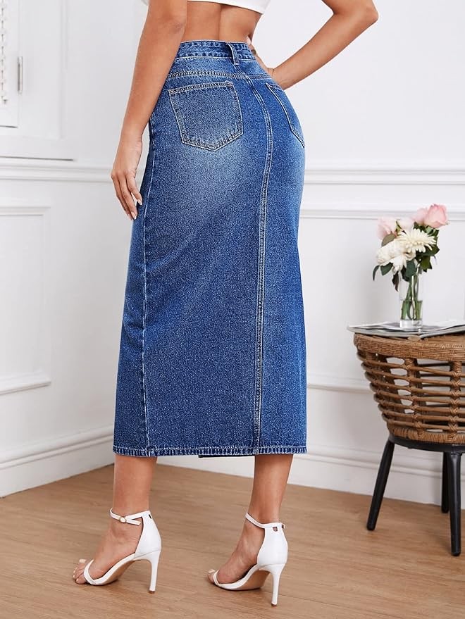 SweatyRocks Women's Casual Denim Skirt High Waist Split Front Long Jean Skirts
