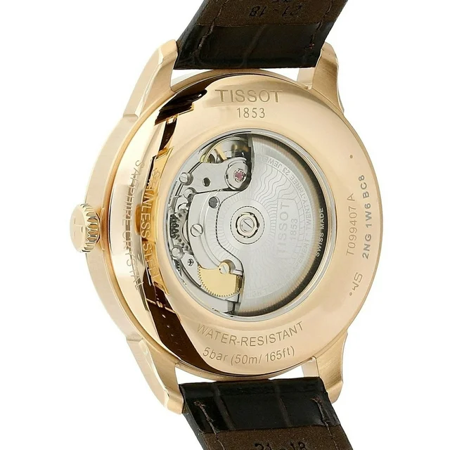 Silver dial enhanced by rose gold-tone alpha-style shape hands. Rose Gold PVD stainless steel case with a brown leather band. Automatic movement. 50 meters / 165 feet water resistance. Fixed bezel. Scratch Resistant Sapphire crystal. Transparent caseback. Butterfly with Push Button Release clasp. Pull / Push crown. Case size 42 mm x 10.89 mm. Band 22 mm x 8 incheslong. Tissot T099.407.36.037.00 Chemin Des Tourelles Watch.
