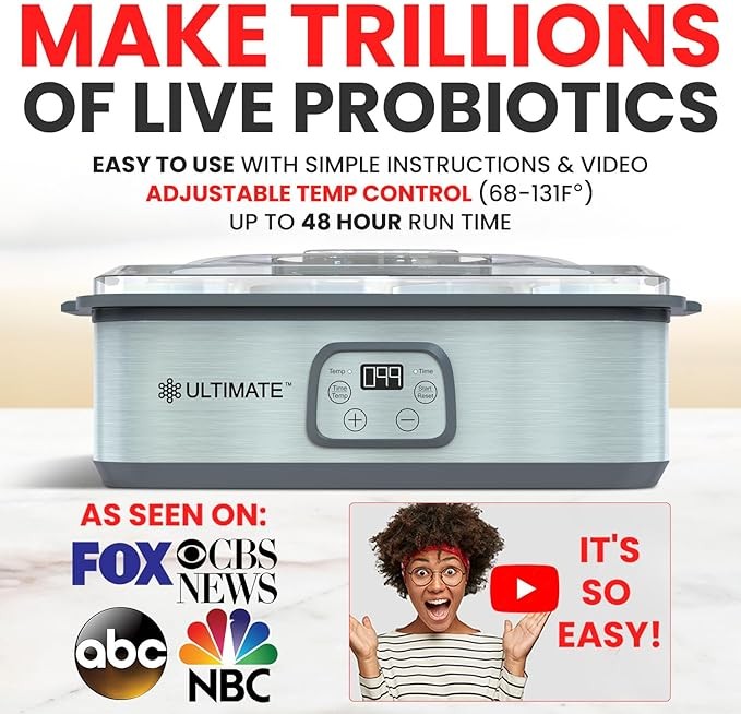 ? AS SEEN ON ABC, NBC, CBS & FOX - Make probiotic yogurt which may help support weight loss, reduce bloating, enhance mood, boost energy levels, improve digestion, promote healthy skin & hair, alleviate inflammation & accelerate muscle recovery! Click Add to Cart Now!
