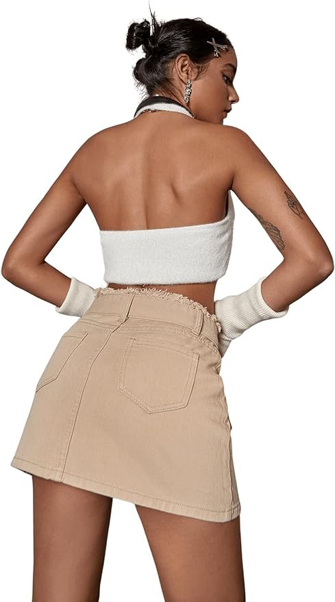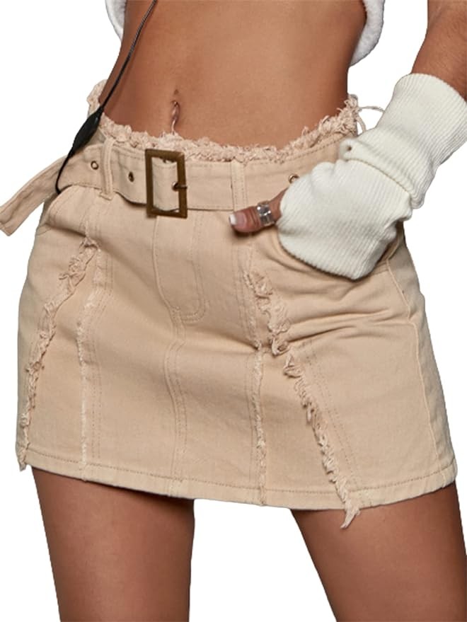 Feature: High waist, zipper and button closure, buckle belt, frayed hem, casual denim mini skirt