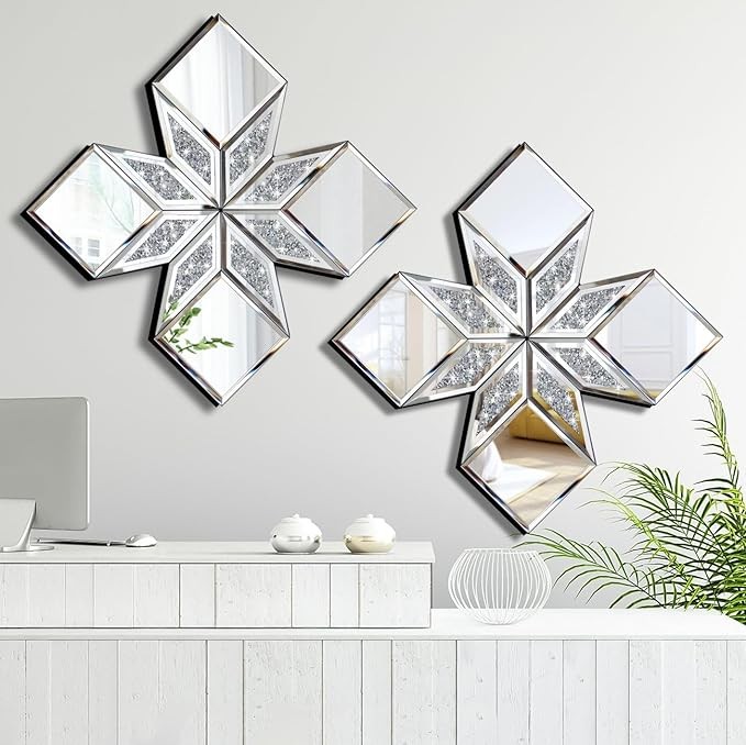 Crushed Diamond Decorative Mirror Dimension: 16.75x16.75 inches, pack of 2 pieces. Silver Mirror and Crushed Diamond artistically Combination provide stereoscopic feeling for wall decor. Each mirror pieces is bevelled in exquisite craft . Flower leaf style stylish design bring modern fashion element for home decoration. Chic Mirror.