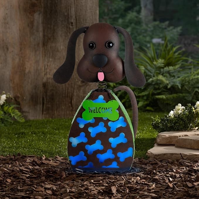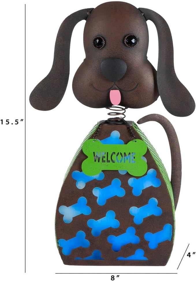 Way To Happiness Solar Metal Rustic Dog Garden Statue Powered Rechargeable Battery Blue Light Bobbling Head Brown Brushed Finish, 15 in Tall
